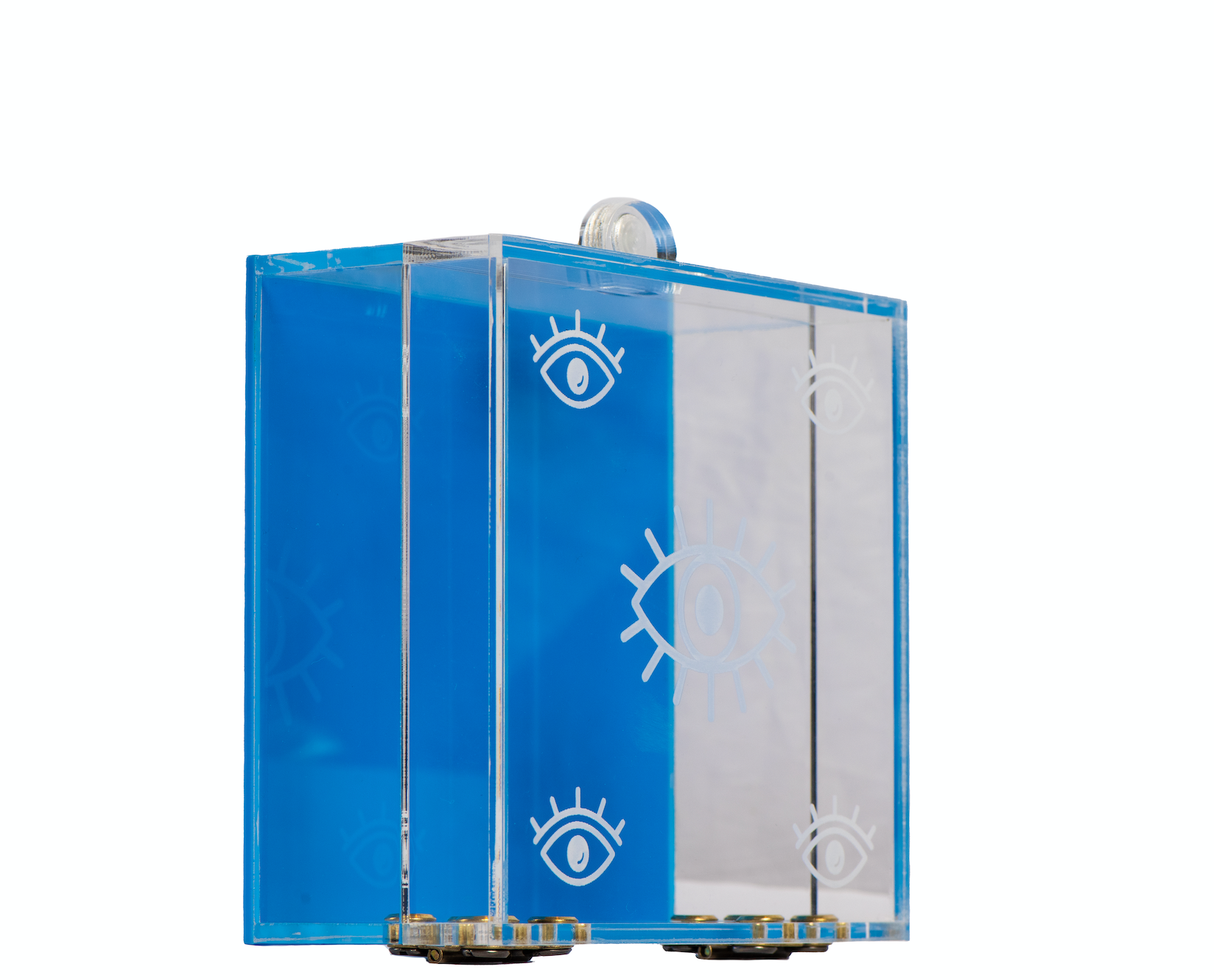 - Color: Transparent with laser cut eye (front) and blue (back)